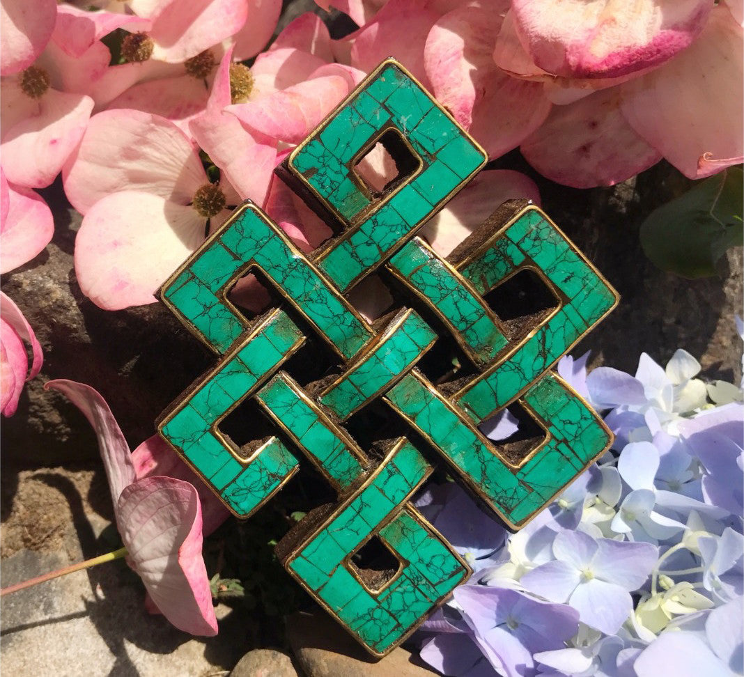 Wooden Knot with inlaid stone and brass wire border. Handmade in Nepal. Comes in three color: Turquoise, Dyed Coral and Lapis. Size: 5.25"tall with 4"wide.