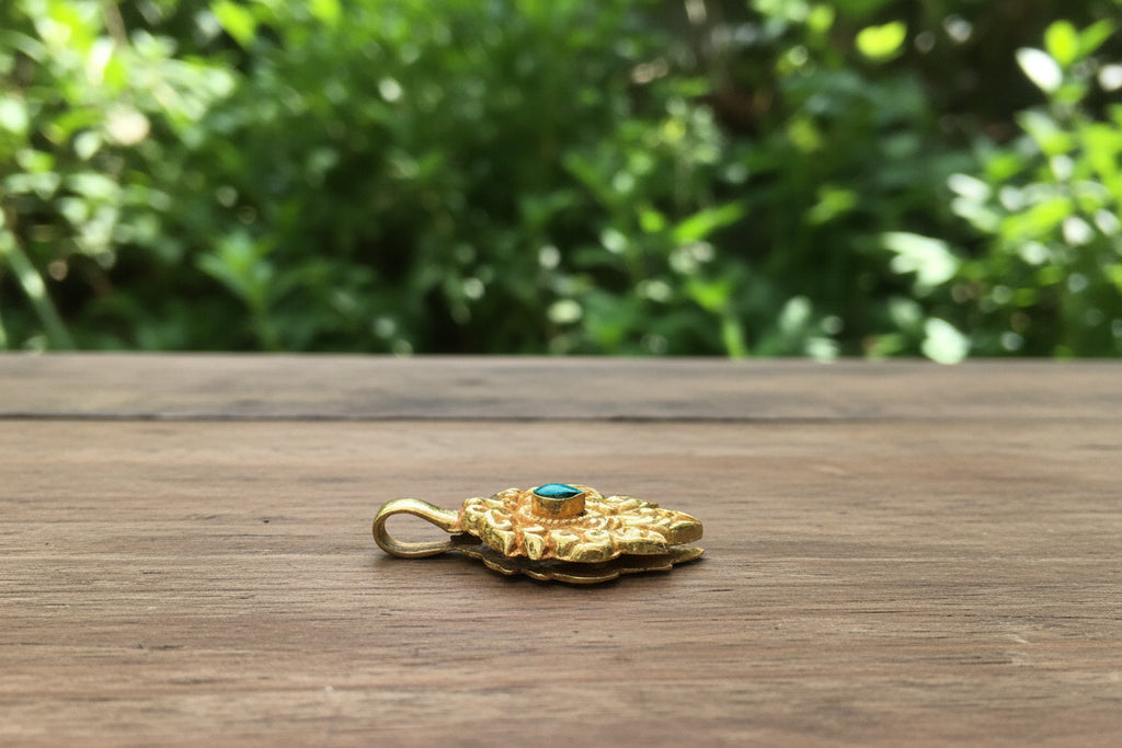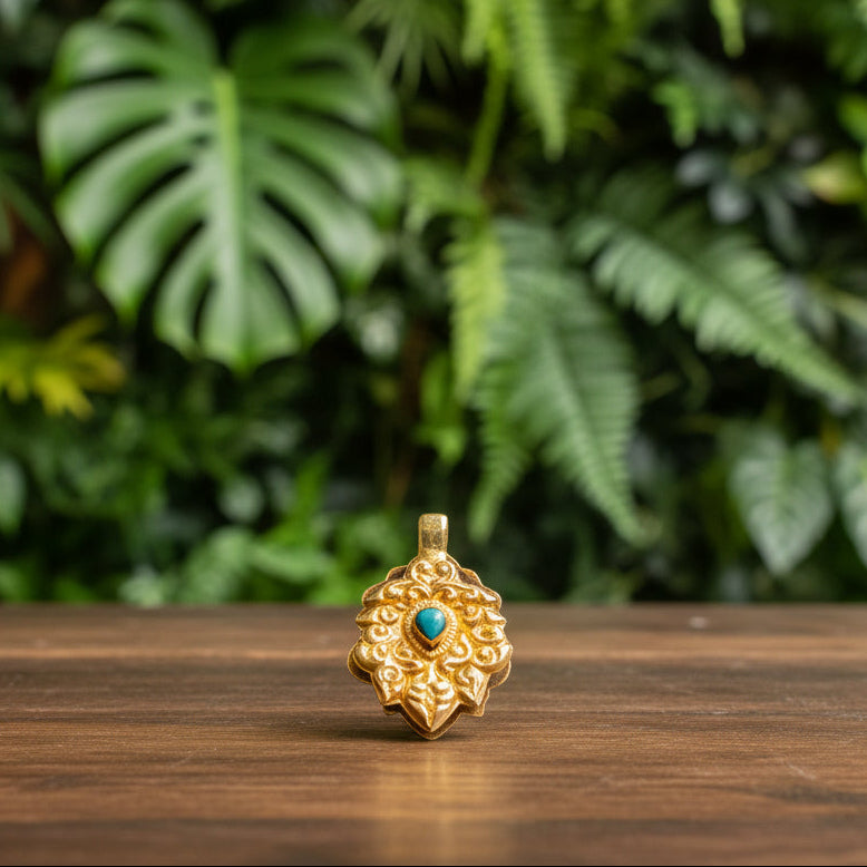 It is entirely handmade by our own master artists in Nepal, following traditional Himalayan metalworking techniques passed down through generations. The intricate repoussé patterns symbolize flowing wisdom and compassion, while the central jewel—set in vibrant turquoise and coral—represents abundance, protection, and the unceasing radiance of awakened mind.