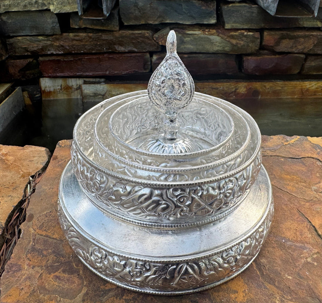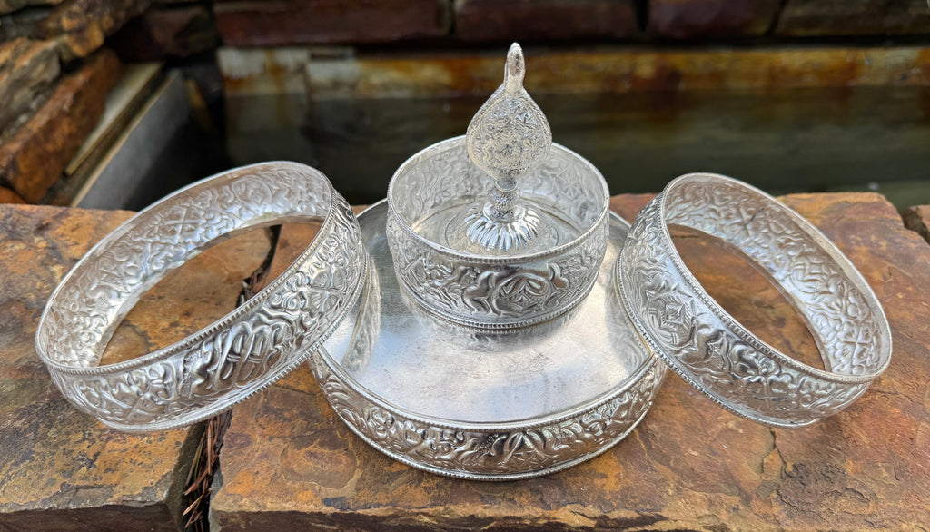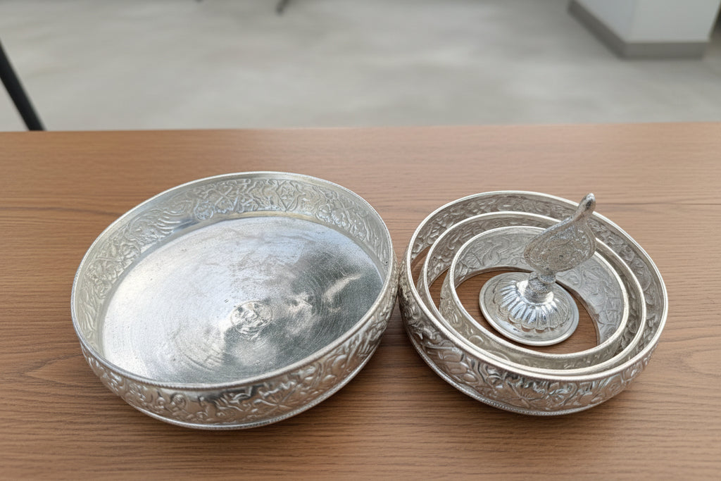 Crafted in India from durable white metal, this set features a classic tiered mandala design with embossed auspicious motifs.