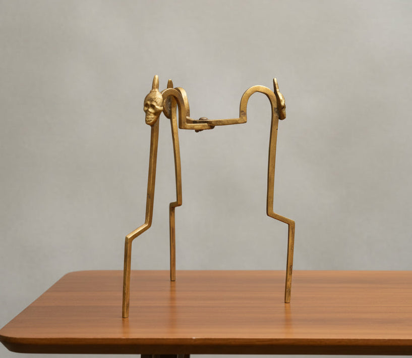 This handcrafted kangsum tripod showcases traditional Nepali brass artistry, meticulously carved by skilled artisans. Each piece features intricate detailing and a sturdy three-legged design, making it both a functional altar stand and a striking decorative accent. The warm patina of aged brass develops character over time, reflecting its authentic heritage craftsmanship.