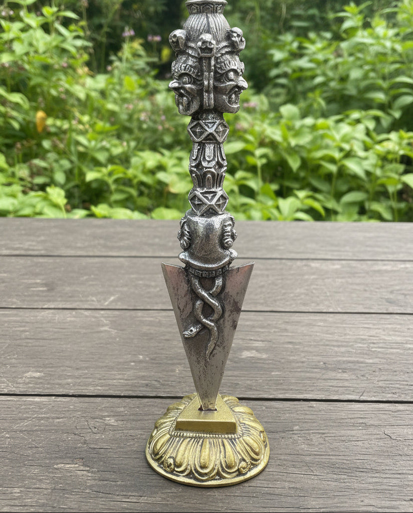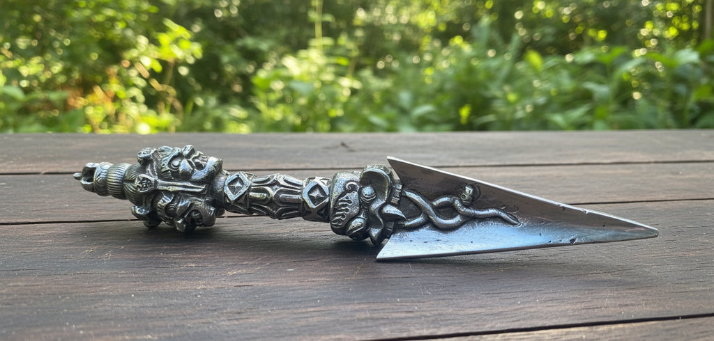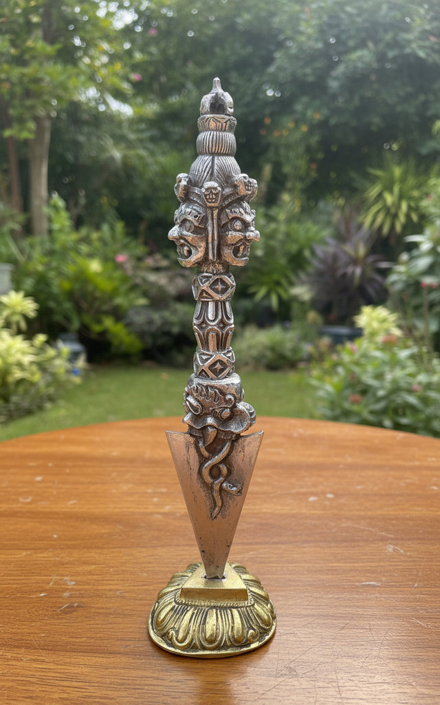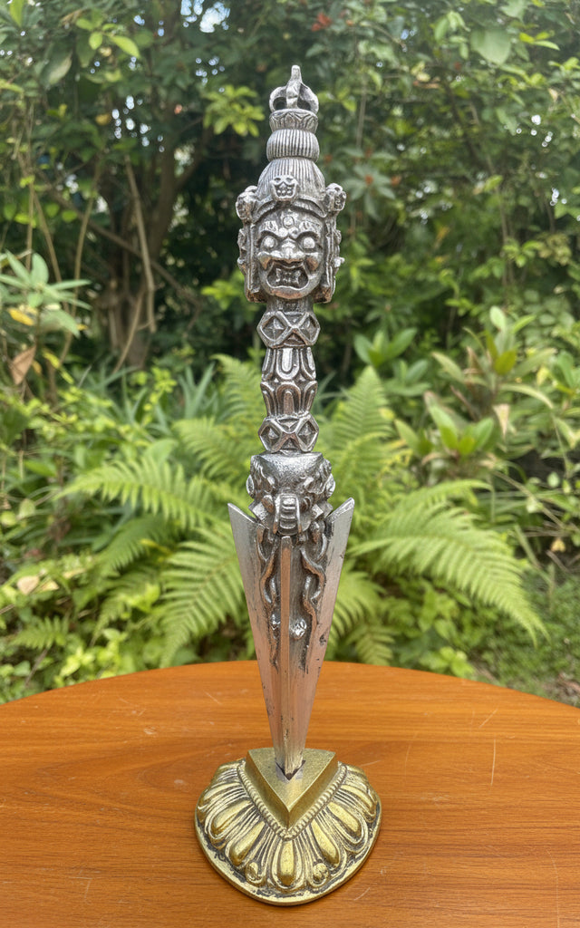 Fine hand crafted Iron Phurba for Ritual practice. Three wrathful deity head represents three Kayas. Beautiful and well carved Phurba.