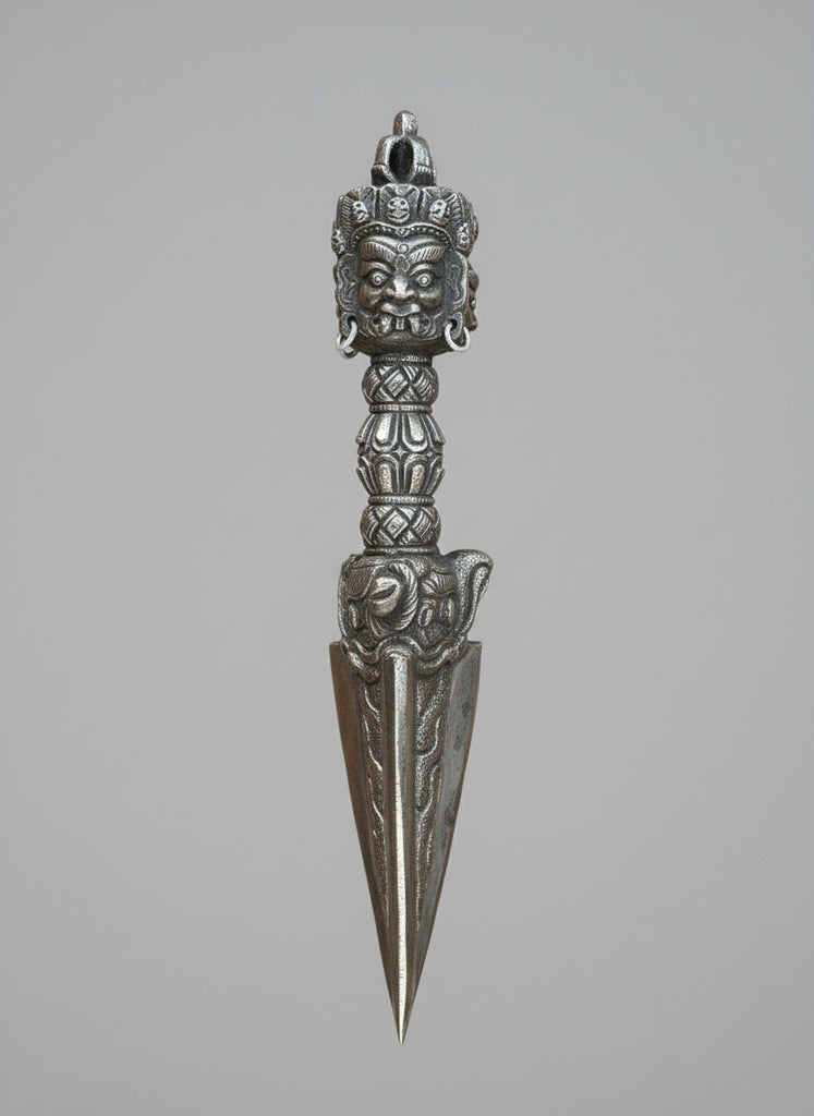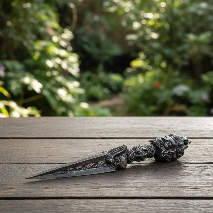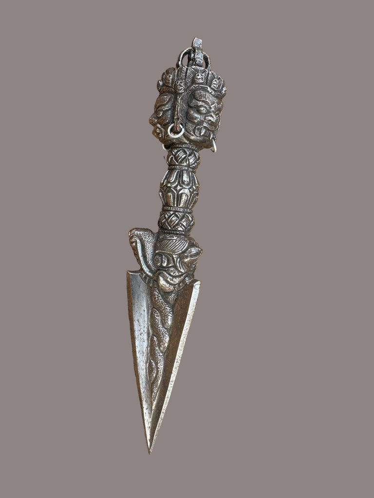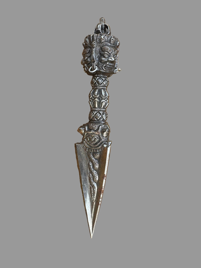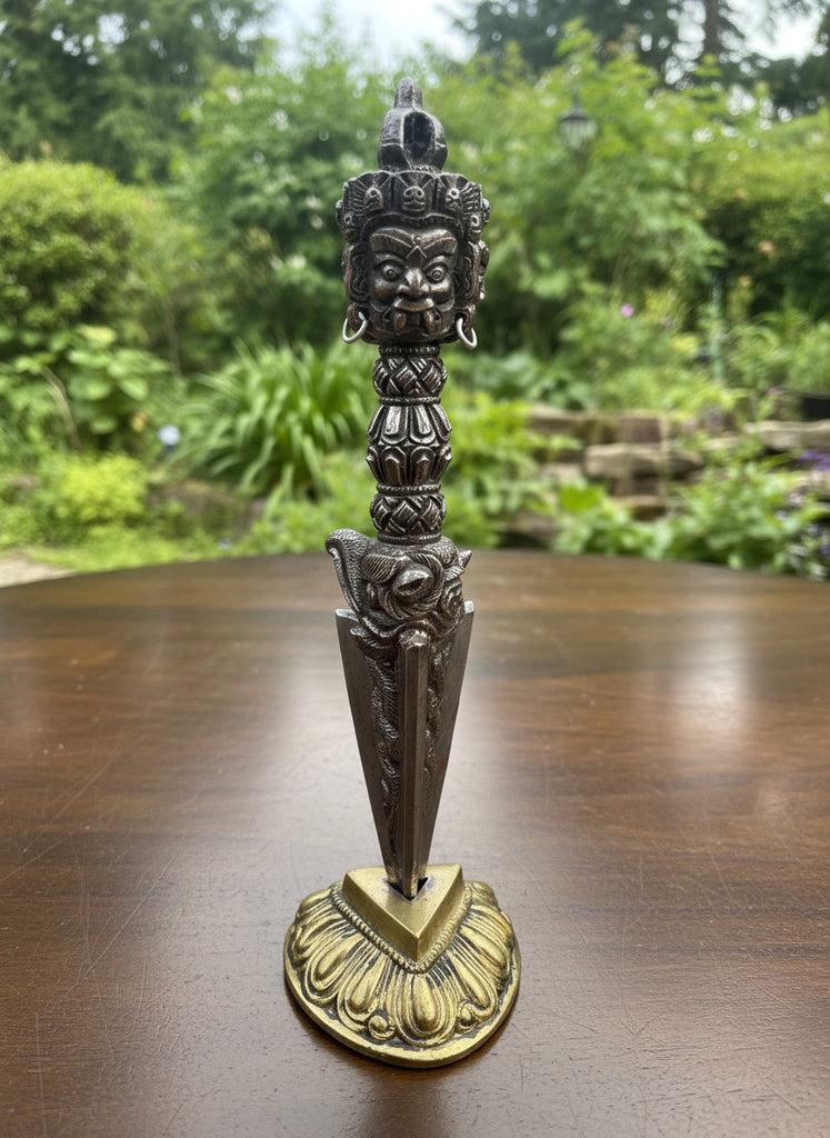 Fine hand crafted Iron Phurba for Ritual practice. Three wrathful deity head represents three Kayas. Beautiful and well carved Phurba with hoop earring. Only One Available!