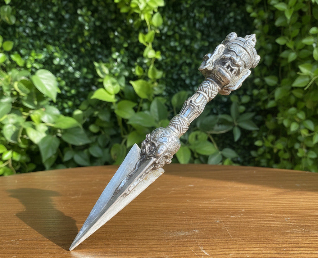 Hand crafted Iron Phurba for Ritual practice with intricate design. The top of the kīla often bears three faces of Vajrakīla, one joyful, one peaceful, one wrathful which represents three Kayas. Beautiful and well carved Phurba with hoop earring.