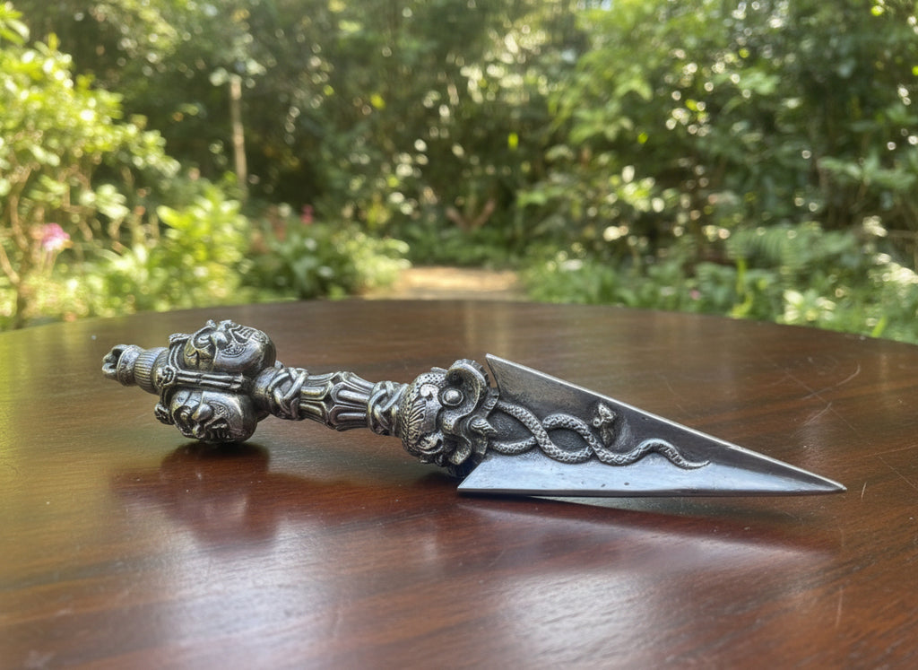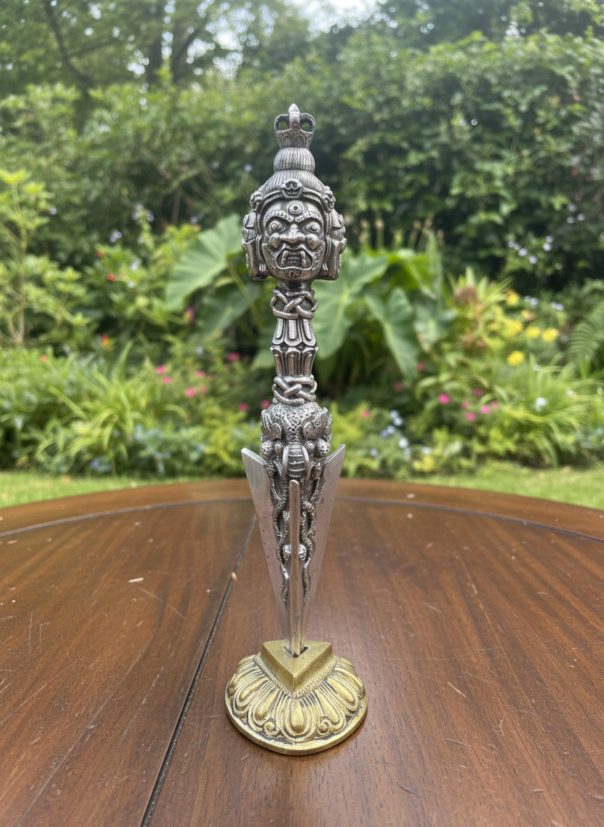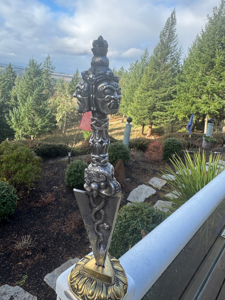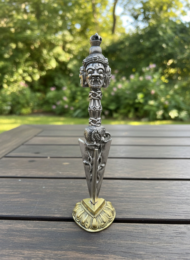 Fine hand crafted Iron Phurba for Ritual practice. Three wrathful deity head represents three Kayas. Beautiful and well carved Phurba.  Only One Available!