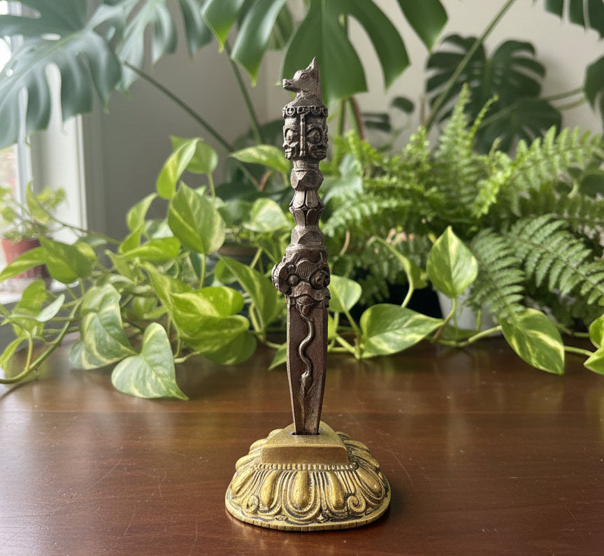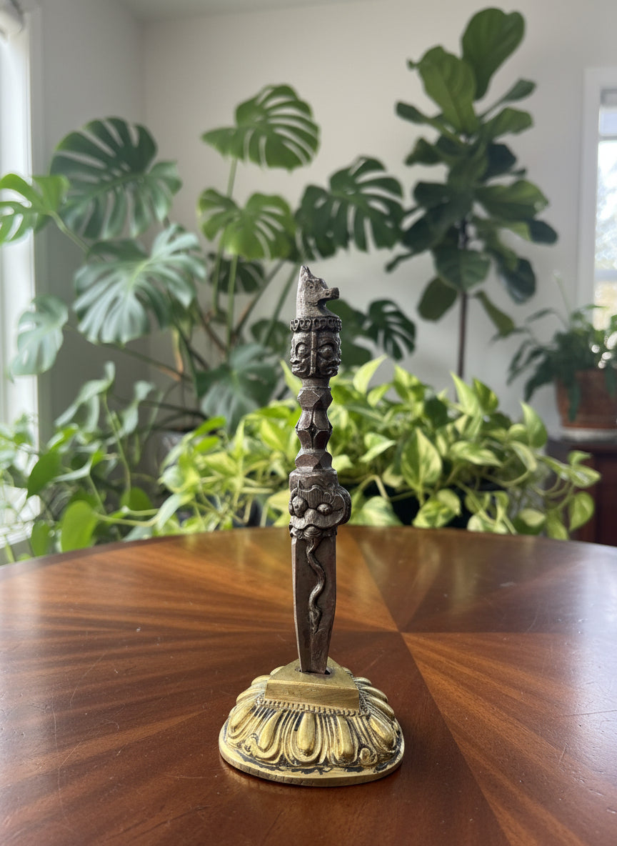 Iron Phurba with Horse head. Phurba also known as Kila in Sanskrit is a dagger with three sided peg which represents removal of obstacles, negative energy and obscuration. This is a one of a kind Hayagriva Phurba that is hand carved from an iron rod.