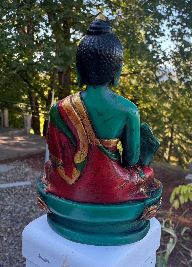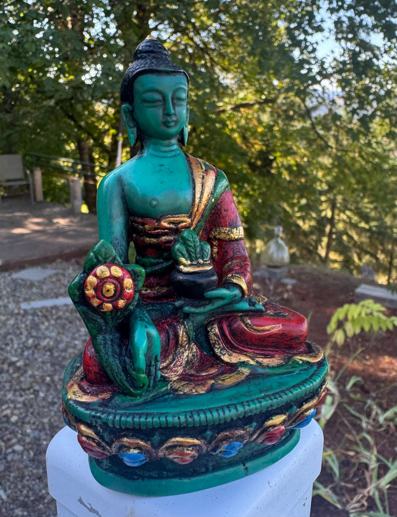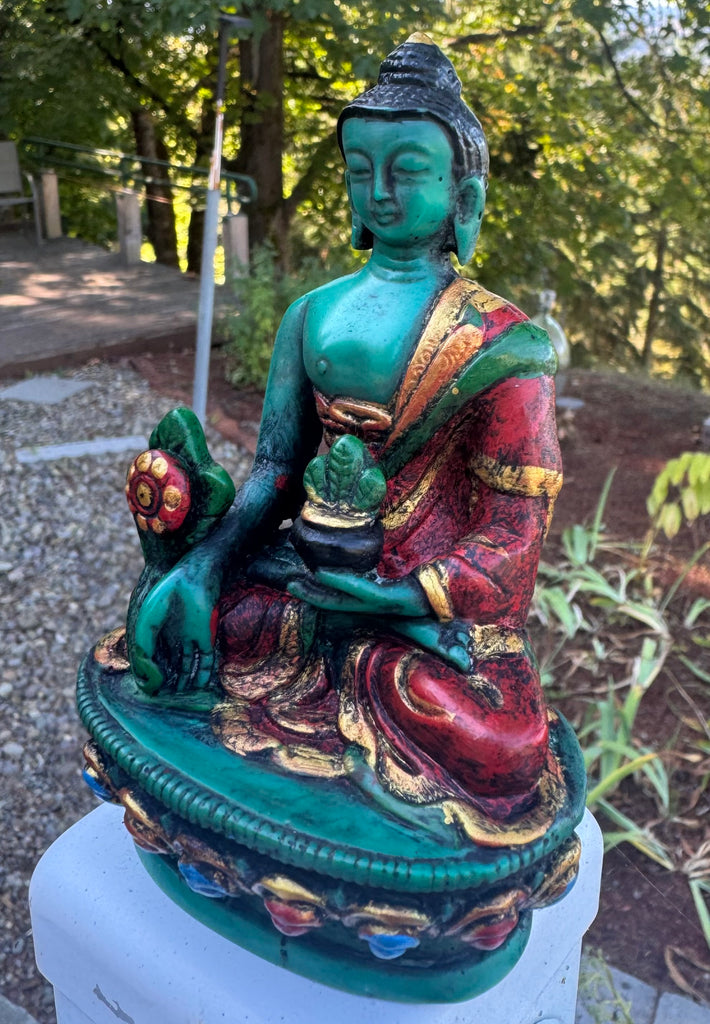 Medicine Buddha statue made from colorful resin. It is a beautiful representation of the healing and compassionate qualities associated with this aspect of Buddha. The use of vibrant colors could symbolize the transformative power of healing and the diverse ways in which healing can manifest physically, mentally, and spiritually. It would serve as a meaningful focal point for those seeking solace, comfort, and well-being.