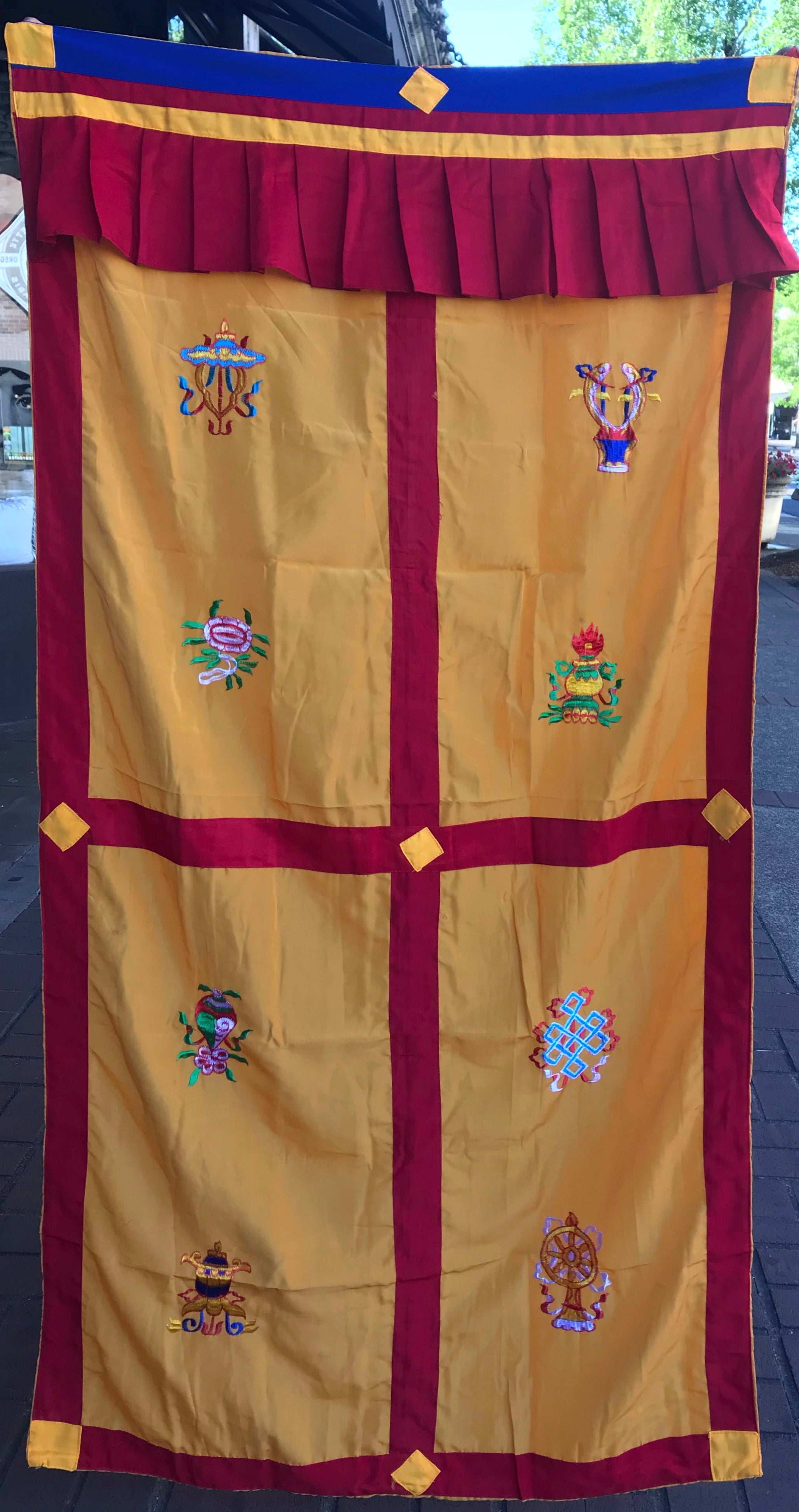 Door Cover: Tibetan Door Covers feature brightly colored designs and serve as simple privacy screens when hung over doorways or windows. Traditionally used for generating good fortune, auspicious circumstances, and for protection from negativity. May also be used as a wall hanging. Great for any home, office, or dorm.