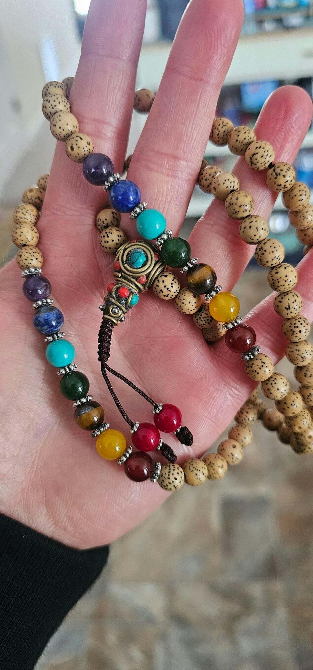 Lotus Seed with Chakra stone Mala beautifully strung on strong brown nylon cord. Prayer bead comes in 108 bead plus the beautiful Guru bead and hand knotted tassel at the end.