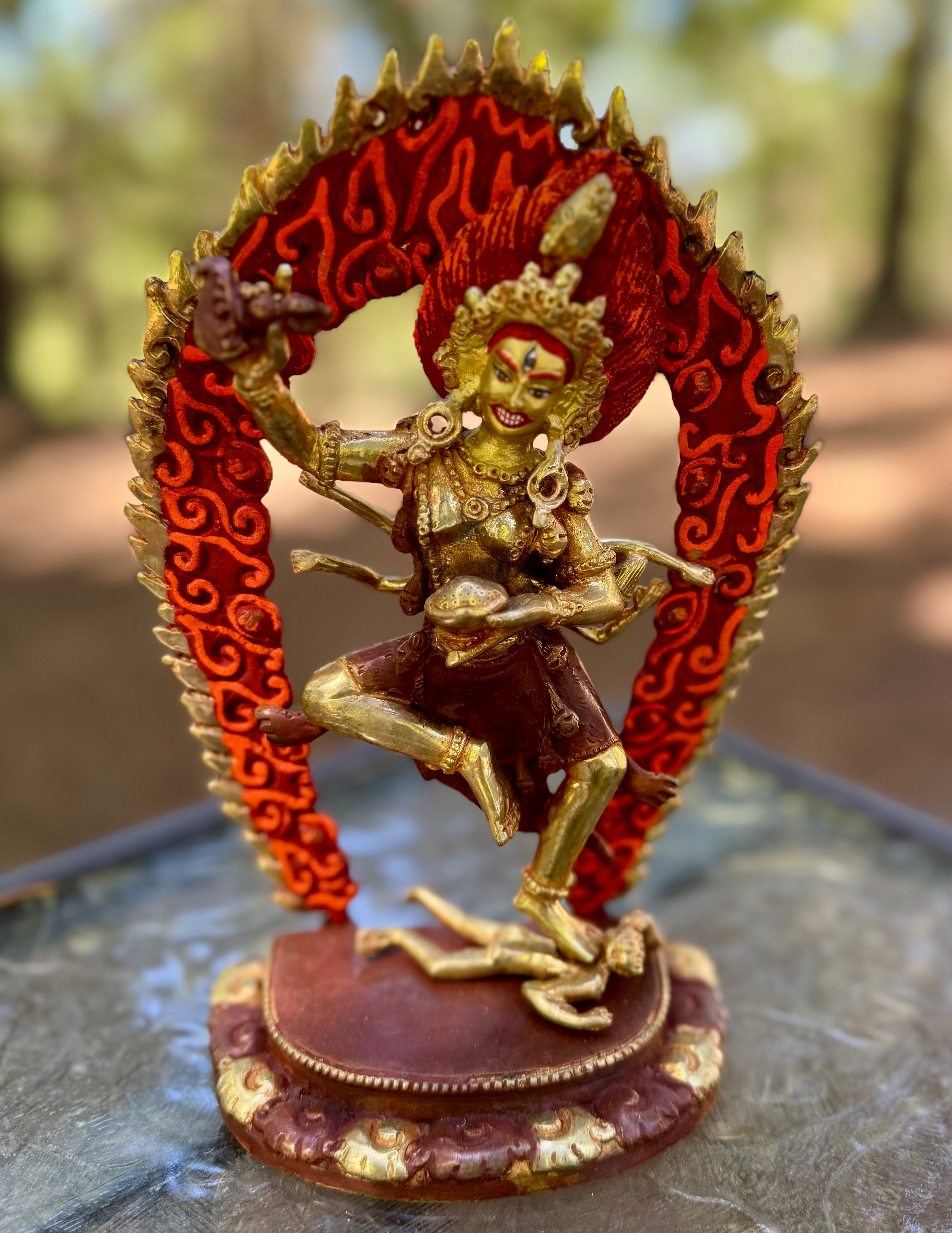 Troma Nakmo represents passion, compassion, and ignorance as well as the wisdom of the all-encompassing matrix from which all phenomena unfold.This beautiful detail Troma nakmo Statue is crafted by an experienced artists of Patan, Nepal. Size: apx 8" tall. Only one available.