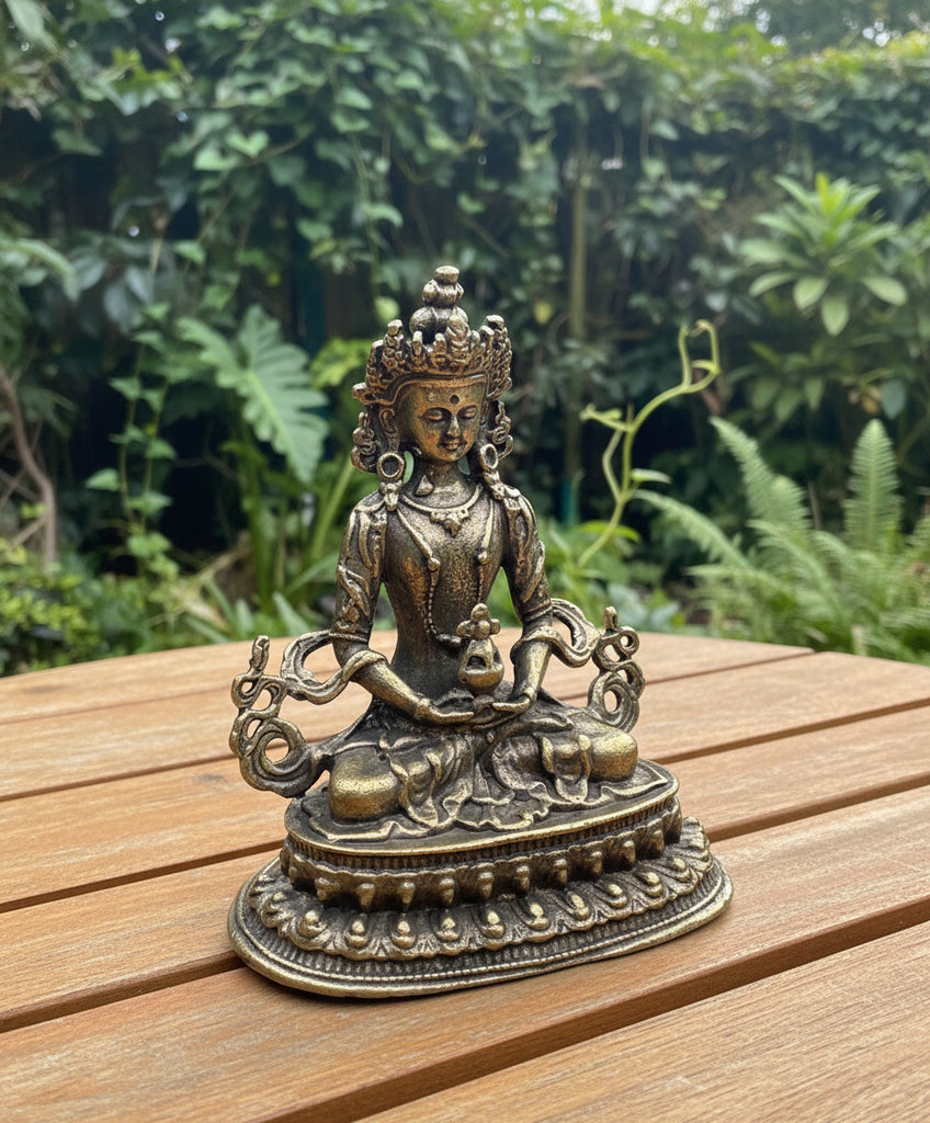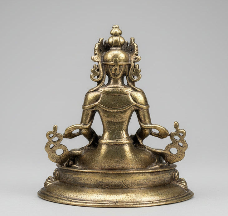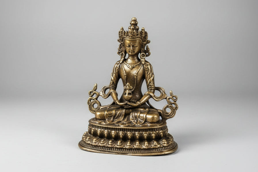 Amitayus, the Buddha of Infinite Life, is beautifully rendered in this brass statue, capturing the serene iconography of longevity and spiritual vitality. Crafted with meticulous attention to detail, this piece showcases the refined artistry characteristic of traditional Buddhist sculpture. The warm patina of brass enhances the meditative presence of the figure, making it an exceptional addition to any altar, meditation space, or collection of sacred art. A meaningful representation of wisdom and extended spiritual practice.