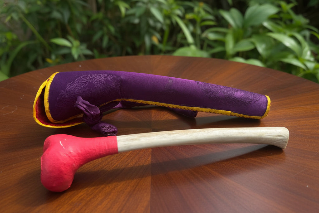 Beautiful Kangling, one of a kind female femur beautiful shape and size. Small and thinly shape, elegant to look at is a rare piece. Lightly weight, only 5oz. The head of the Kangling is covered with leather to protect the bone and the Mouthpiece has been filled with beeswax to create a great sound. Tibetan Kangling horn used in Tantric Buddhist Rituals. It is a musical instrument with very special and magical qualities.