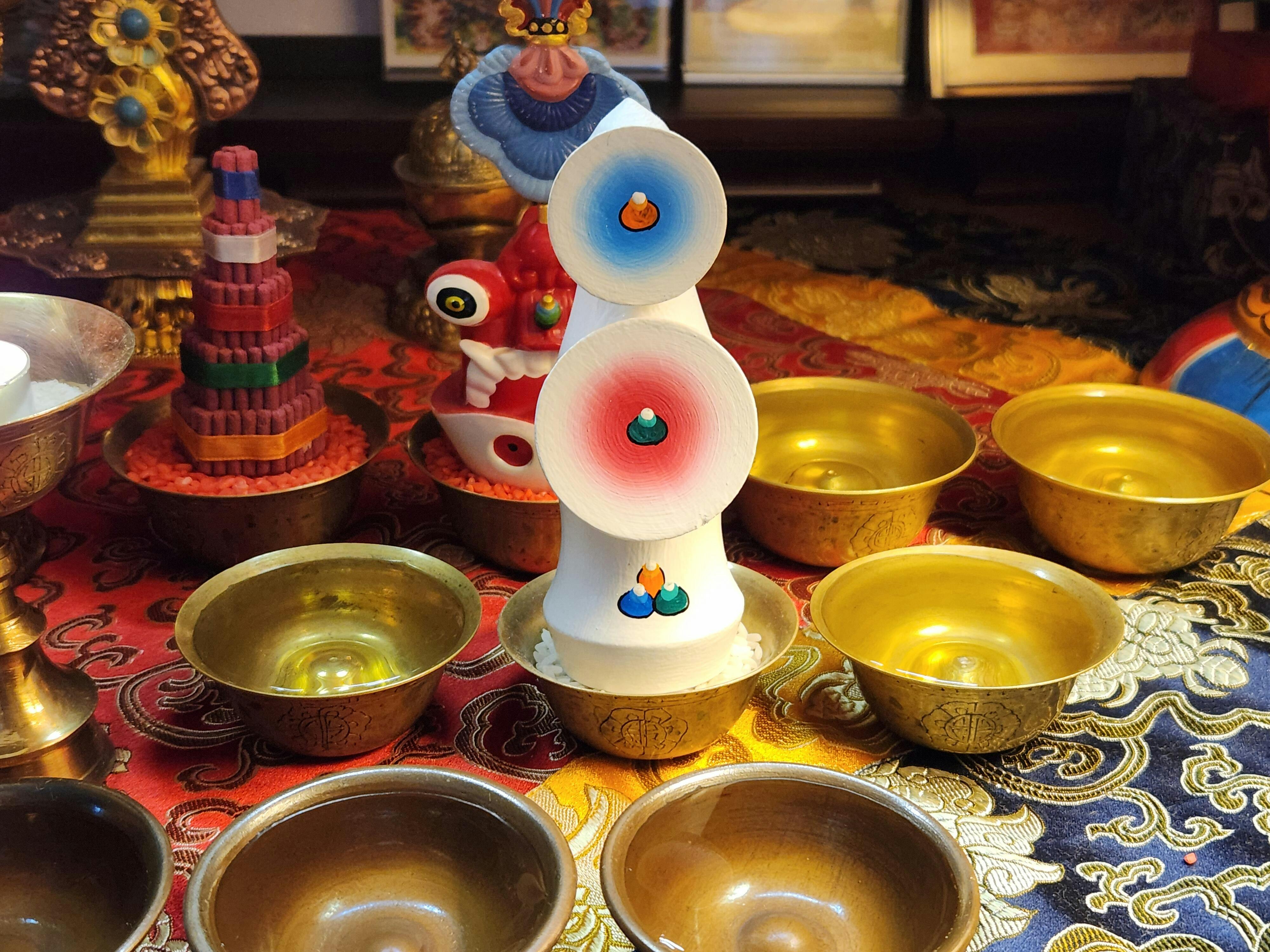 Peaceful White Torma or Sheva Shalze : The Peaceful Torma represents the limitless desirable offerings in existence and especially outer peaceful offerings of drinking water, washing water, flowers, incense, light, perfumed water, food, and music. Peaceful offerings are pleasing to the senses and thus enhance positive qualities. Generally placed on the shrine or in front of the mandala.