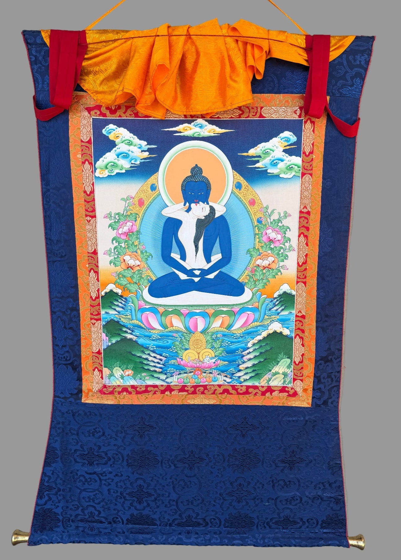 Samantabhadra Yab Yum also known as KuntuZangpo Yab Yum in Tibetan Thangka. Beautiful hand painted thangka in Nepal. Comes with silk brocade frame, wooden stick on the bottom with dowel on both side.