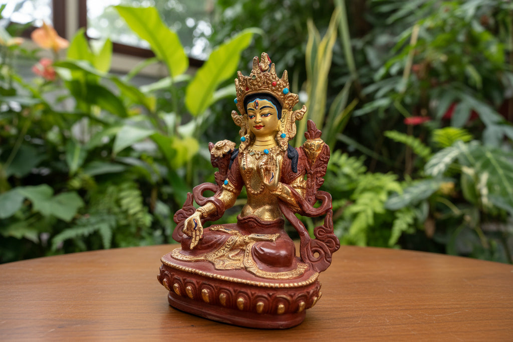 White Tara Statue, made out of copper gild in Napal: A female Buddha who dispels hindrances to one's longevity. Fine copper cast with gold-leaf face, nice detail.